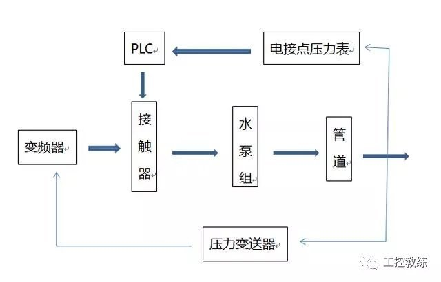 變頻器的作用是為電機(jī)提供可變頻率的電源,從而實(shí)現(xiàn)電機(jī)的可無極調(diào)速,能夠保證管網(wǎng)水壓保持恒定。壓力傳感器的作用是檢測管網(wǎng)水壓。